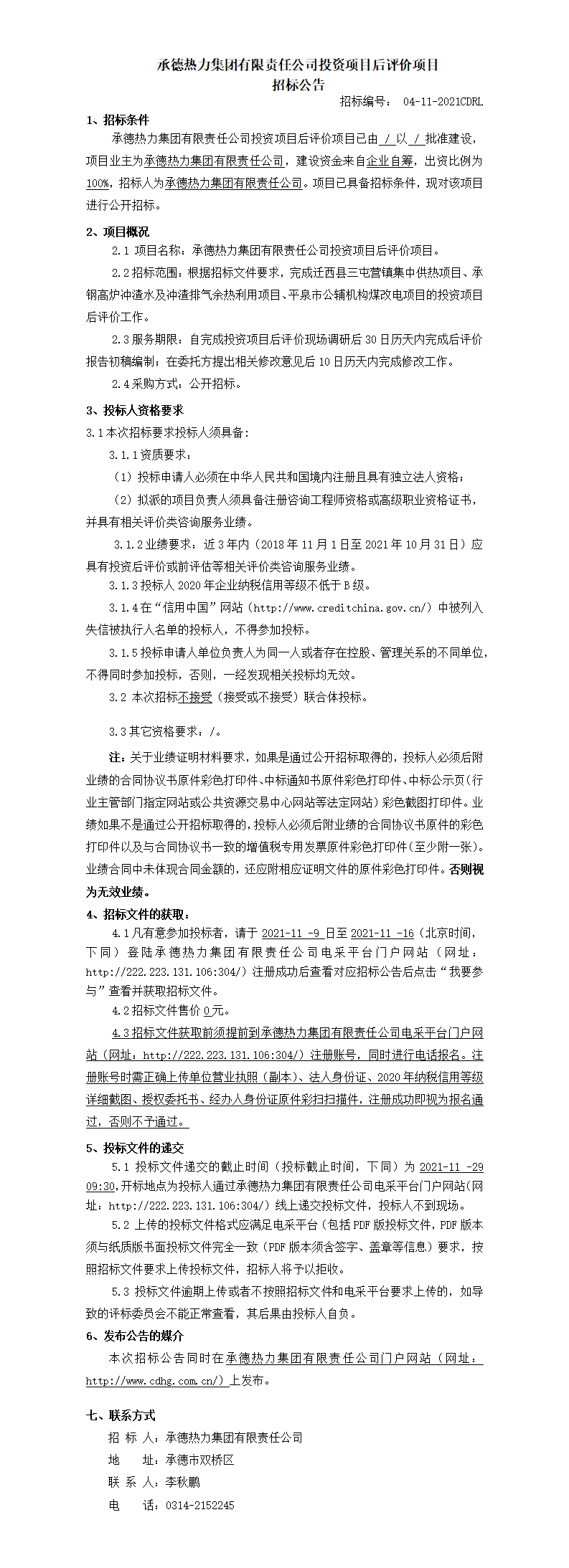 承德熱力集團有限責(zé)任公司投資項目后評價項目招標(biāo)公告