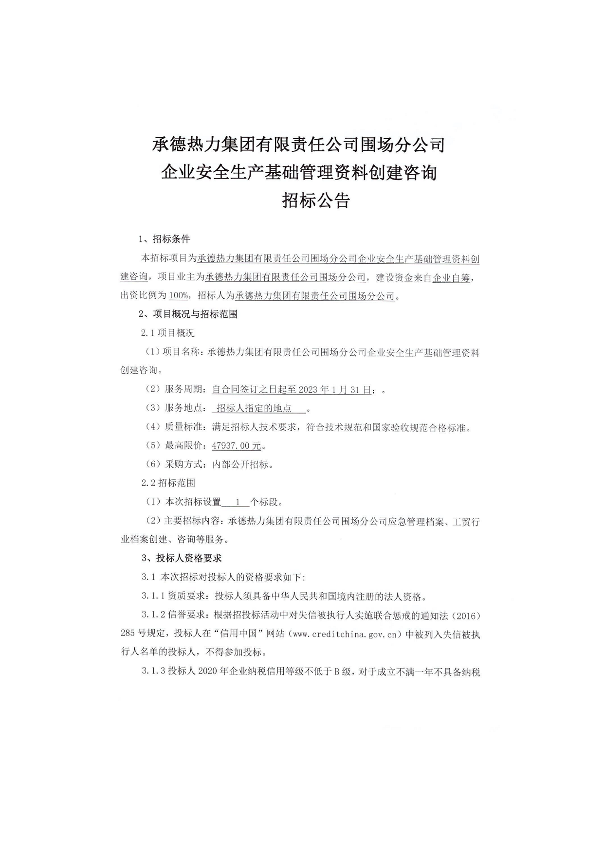 承德熱力集團有限責(zé)任公司圍場分公司企業(yè)安全生產(chǎn)基礎(chǔ)管理資料創(chuàng)建咨詢招標(biāo)公告