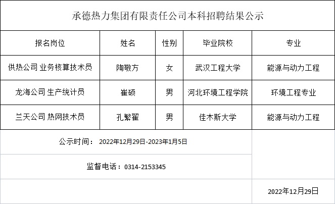 承德熱力集團有限責(zé)任公司本科招聘結(jié)果公示