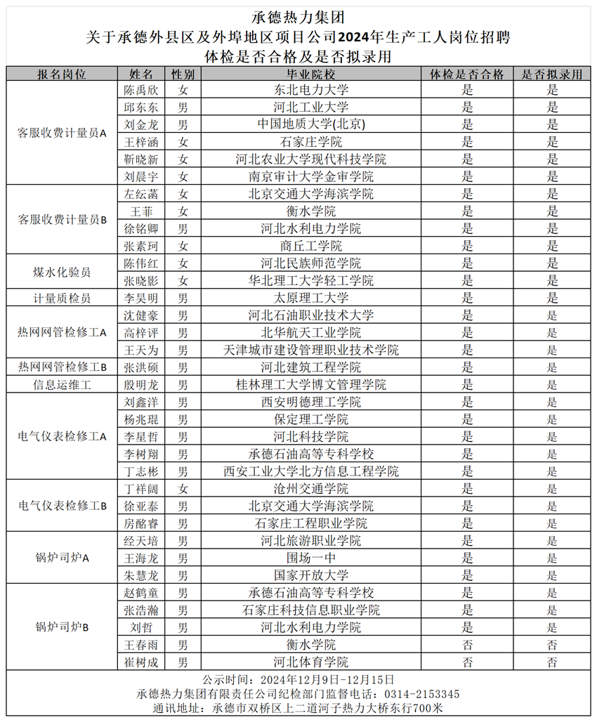 關(guān)于承德外縣區(qū)及外埠地區(qū)項目公司2024年生產(chǎn)工人崗位招聘體檢是否合格及是否擬錄用